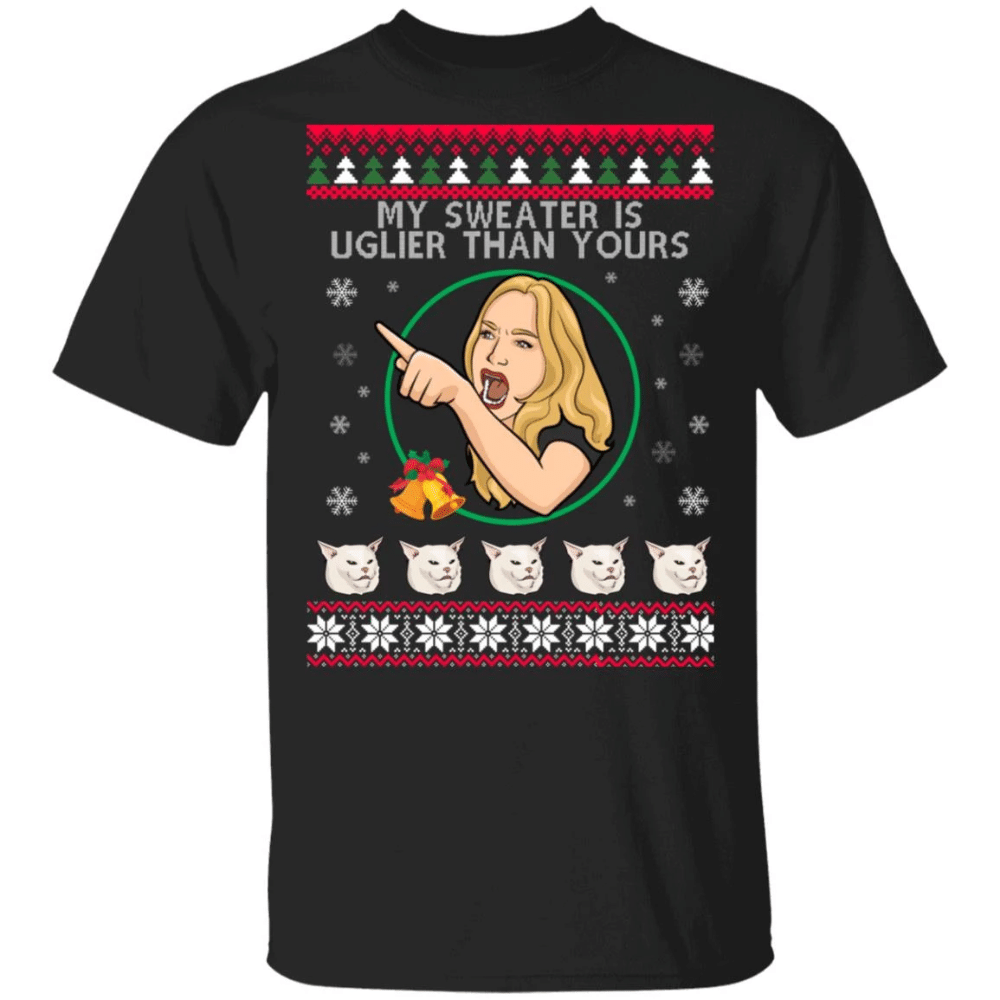 Are you looking for some special gift Woman Yelling At A Cat My Is Uglier Than Yours Shirt for your friends, your father, your mother, son, boyfriend, girlfriend? We have this idea for you. This product Woman Yelling At A Cat My Is Uglier Than Yours Shirt is perfect for you. Our T-shirt made of ringspun cotton for smoothness and body, and added rayon and polyester for extra stretch, drape, and breathability, this will be your new favorite t-shirt.